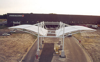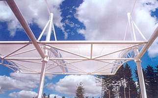 Charpente tubulaire acier et couverture en grille polyamide enduite PVC.